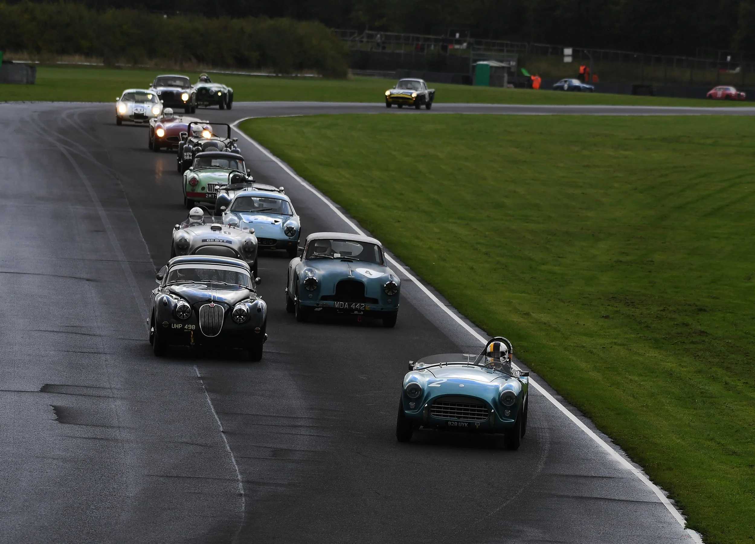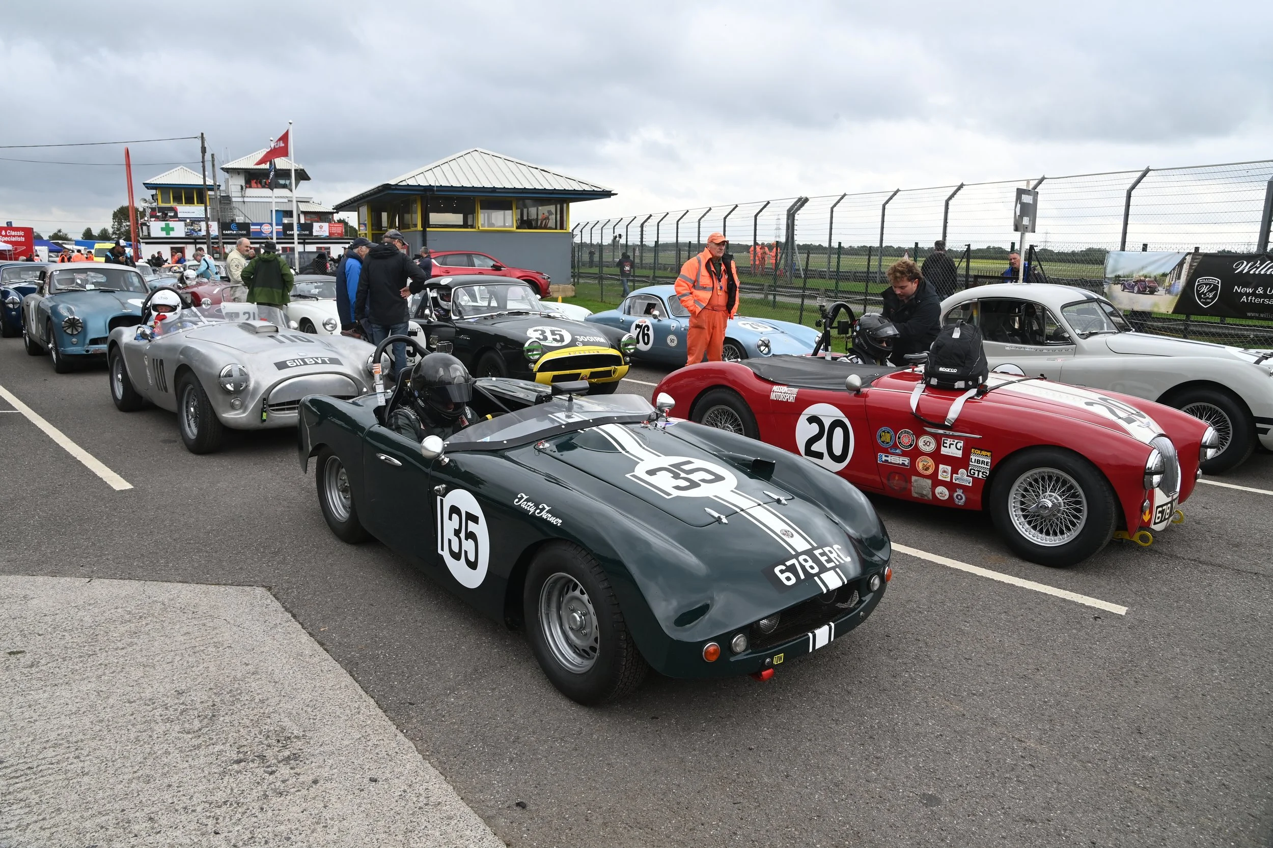 Heavy cloud hung over the circuit for qualifying but the track was dry. The anticipated battle for pole did not really materialise as David Alexander clocked a 1.23.461 to annex it in his Lotus Elite, over a second clear of Jonathan Abecassis in his Austin Healey 100/4. Jonathan’s time of 1.24.571 was itself over a second ahead of the LECo of Scott Quattlebaum who recorded a 1.25.887 although the gap to 4th placed Rory Tollett in the Austin Healey 100M was much closer smaller, less than a tenth behind on a 1.25.975. Half a second back in 5th with a time of 1.26.480 was Andrew Mitchell in his Lotus Elite which he was sharing with Mark Morgan, this pairing now performing consistently well. Another driver pairing was in 6th, the AC Ace entered by David Cottingham and shared with Adrian King with a best time of 1.26.668. Marc Gordon (Jaguar XK150) and Tim Stamper (Aston Martin DB2/4) shared the 4th row with times of 1.26.799 and 1.27.704. In view of past performances, I would have expected Marc to be a little higher up the grid but Tim’s time was pretty good considering that, historically, he has tended not to worry too much about his qualifying position. Andy Shepherd’a time of 1.27.781 kept him ahead of what appeared to be a slightly subdued Brian Arculus in his Lotus Elite, another who I would have expected to be a little higher up the grid. Brian’s time was 1.28.122 and I do wonder whether, despite a dry track, there was a certain degree of wariness on the part of the drivers to push too hard on this challenging track. Save it for the race!