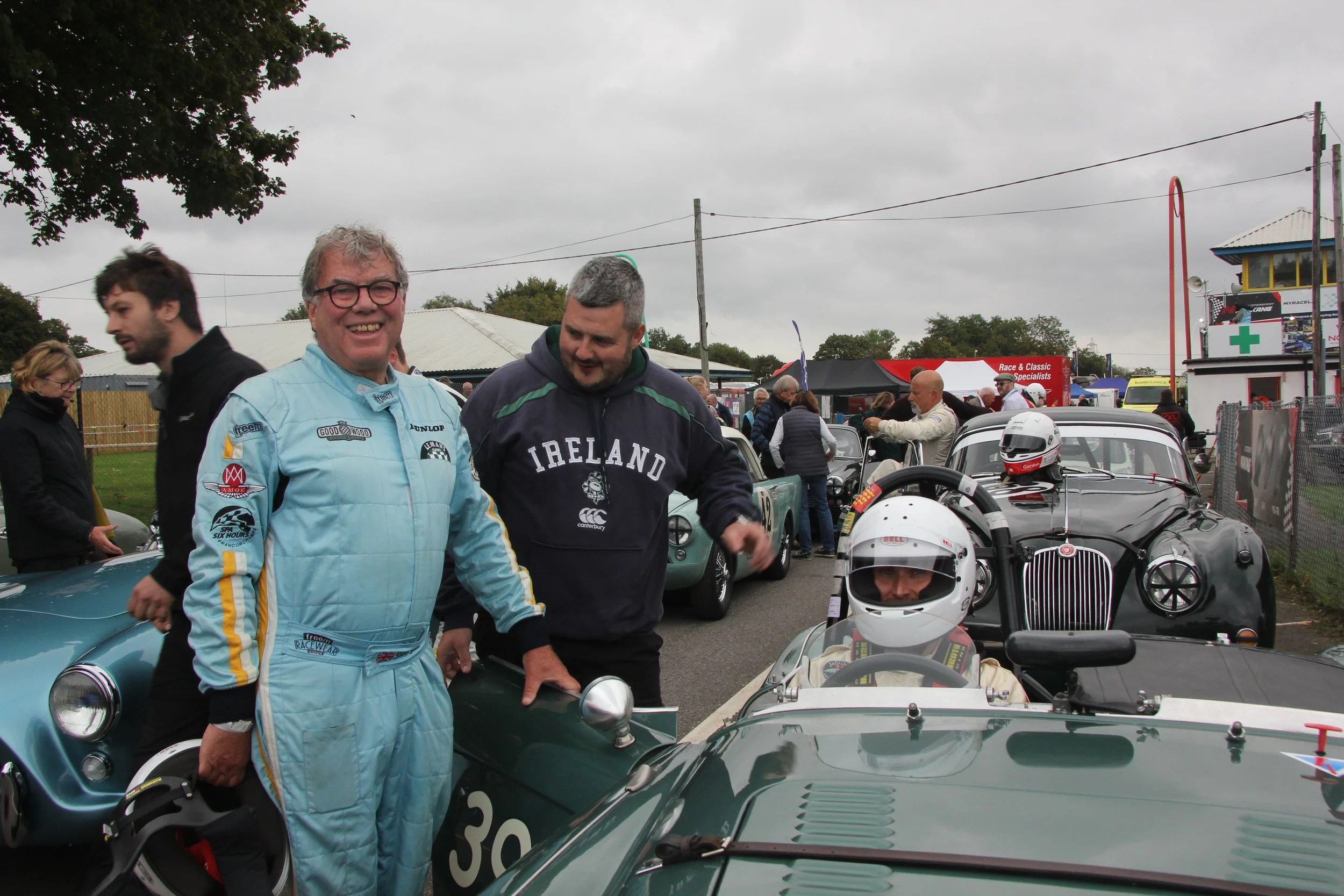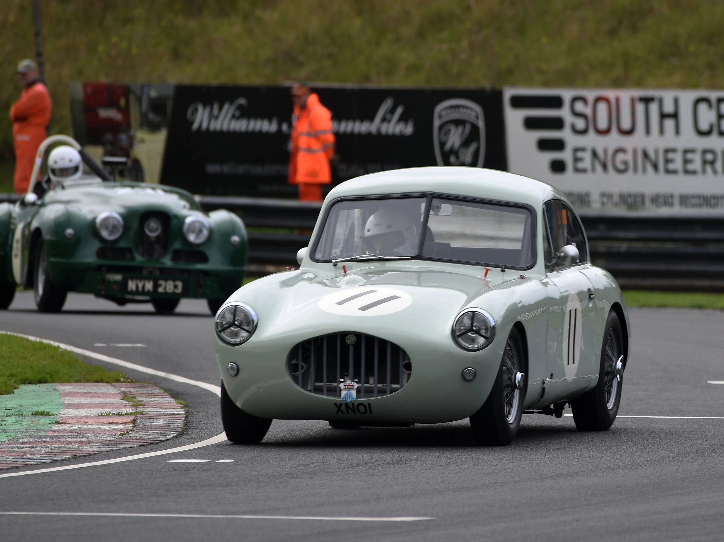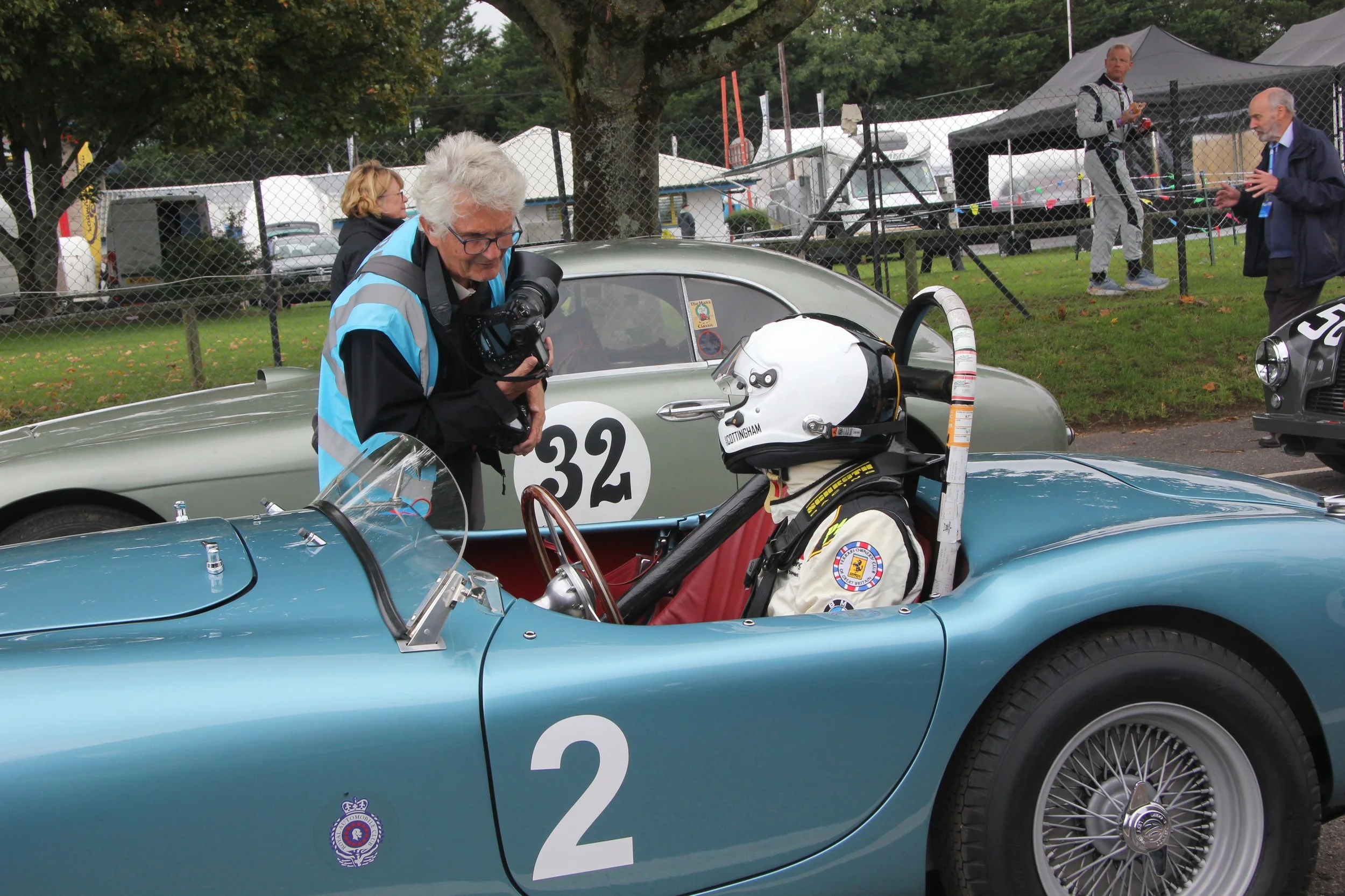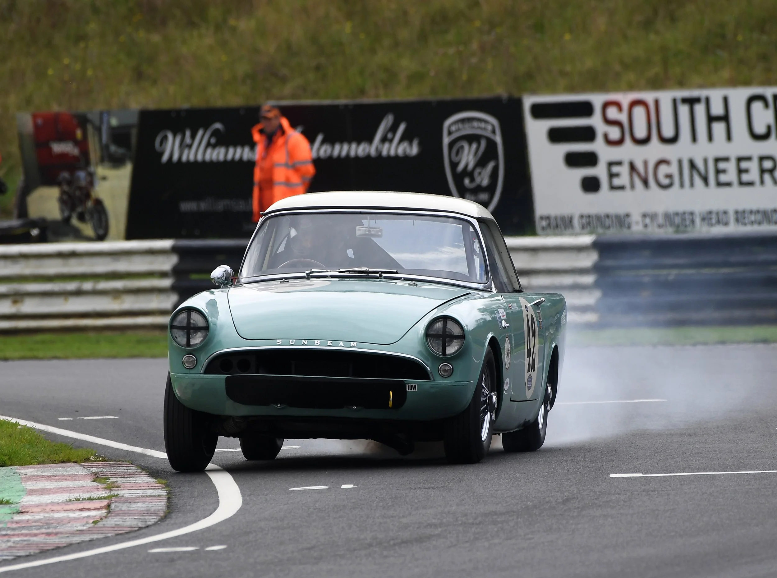 Mark Daniell was next up in his MGA Twin Cam, on 1.28.361, sharing row 6 with Mike Henney in the Turner Climax in a very close time of 1.28.448 and this had all the makings of a close encounter. Mark Hoble was 13th on the grid, in a time just half a second off Mike’s time on 1.28.984, in his Morgan +4 whilst alongside was Chris Mann, even closer on 1.29.053, in the Alfa Romeo Disco Volante, a car that is now so familiar to us, we sometimes overlook how incredibly special it is. In 15th, Barry Dye had his Lotus Elite in 15th, with a time of 1.30.278 on what in effect is his local track, although I use the word ‘local’ advisedly since it’s still a bit of a trek from Cornwall! He shared row 8 with Peter Baker’s lovely Aston Martin DB2 and it was good to see him back with us, on 1.31.047. Tristan Bradfield had qualified his Sunbeam Alpine Le Mans in a time of 1.31.047, but had pulled in early with oil pressure concerns. Alongside Tristan, Chris Bates had put Harry Naergar’s Jowett Jupiter in 18th position with a 1.32.576. Ed Shah was 19th on a time of 1.33.254 and only a very little slower on 1.33.358 was Gareth Evans in his Sunbeam Alpine. Unfortunately, after two hard years of opposite lock cornering, the rear nearside hub on the Alpine cried enough and decided to part company with the rest of the car, bringing Gareth’s qualifying to an early close and preventing a race start. Were we to be short of Sunbeam Alpine representation in the race?