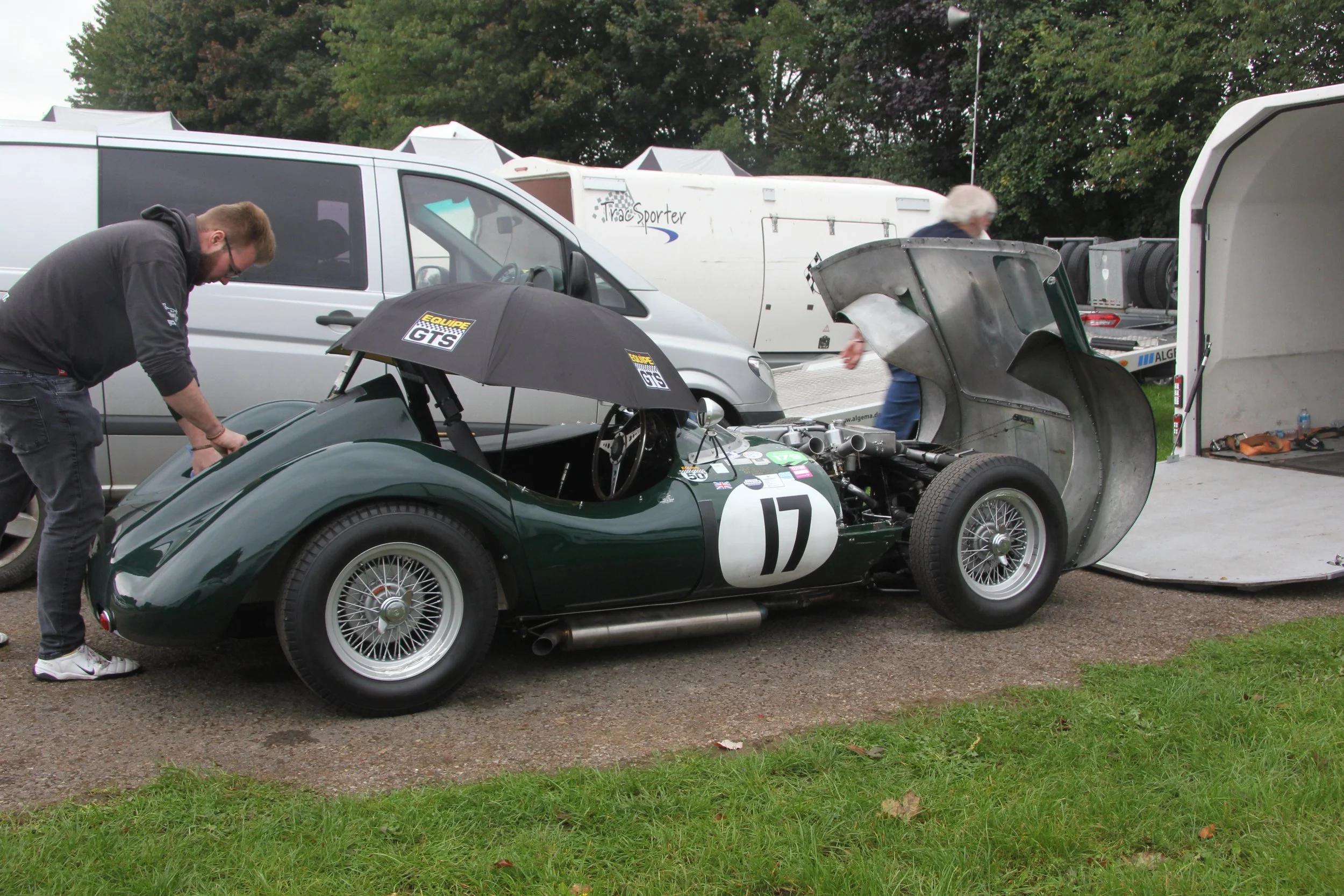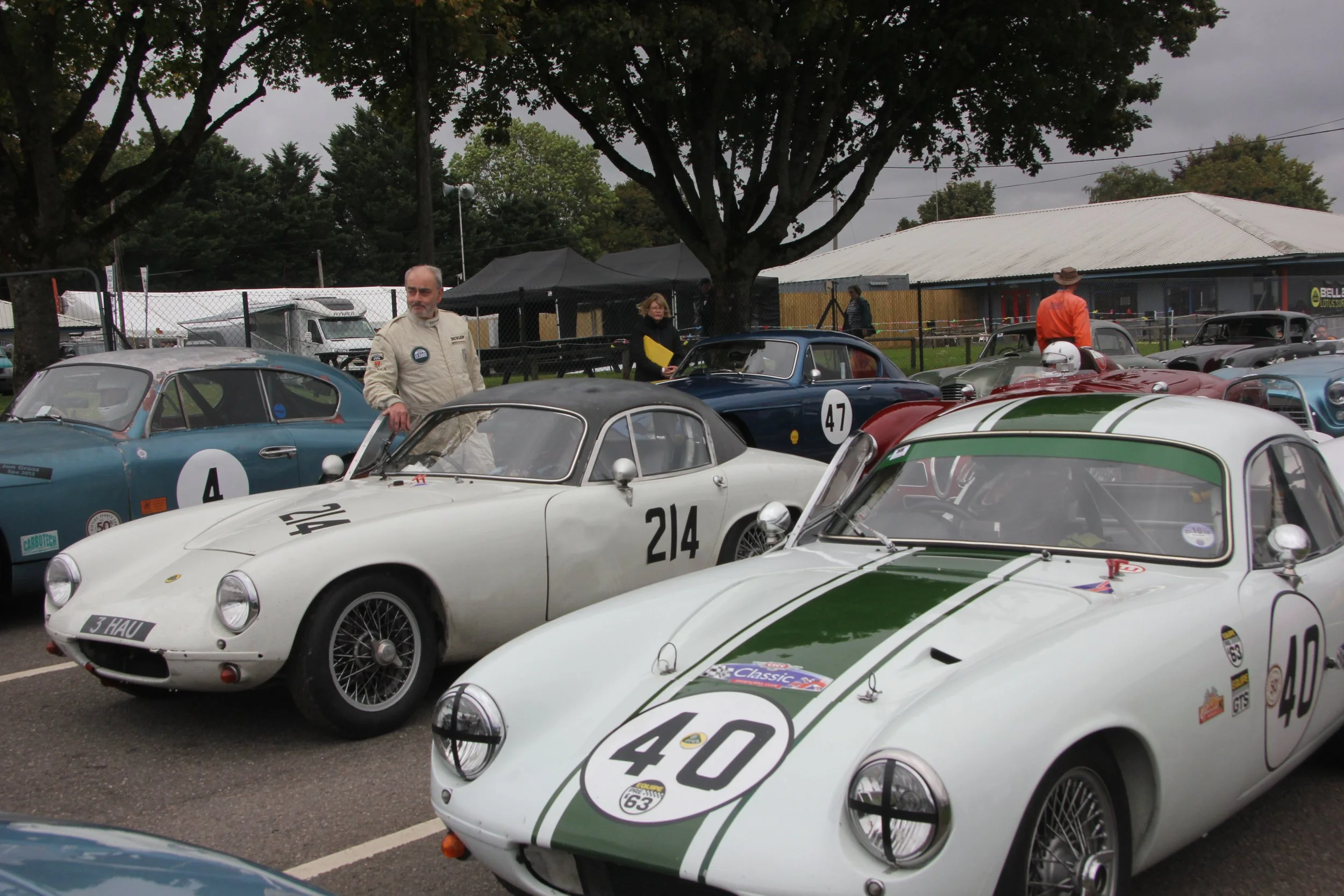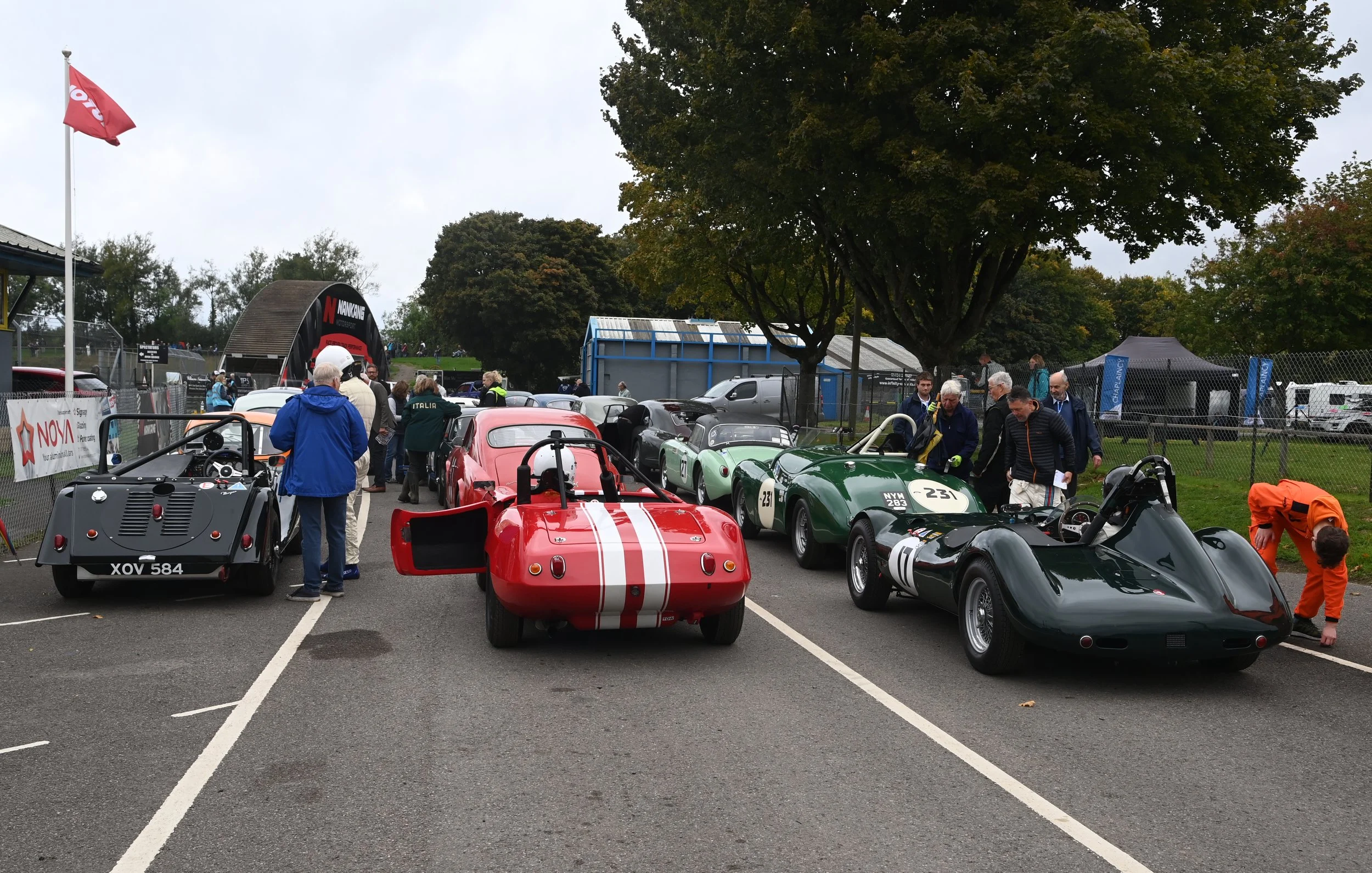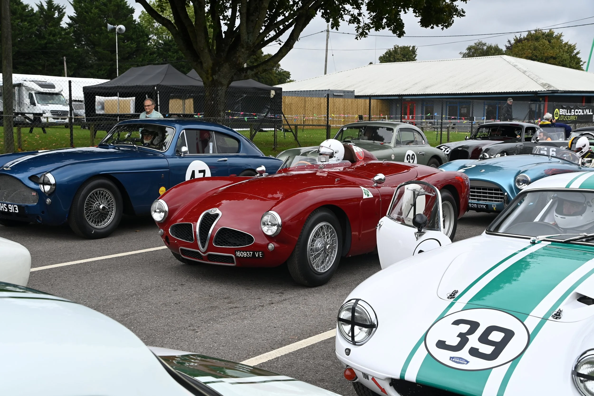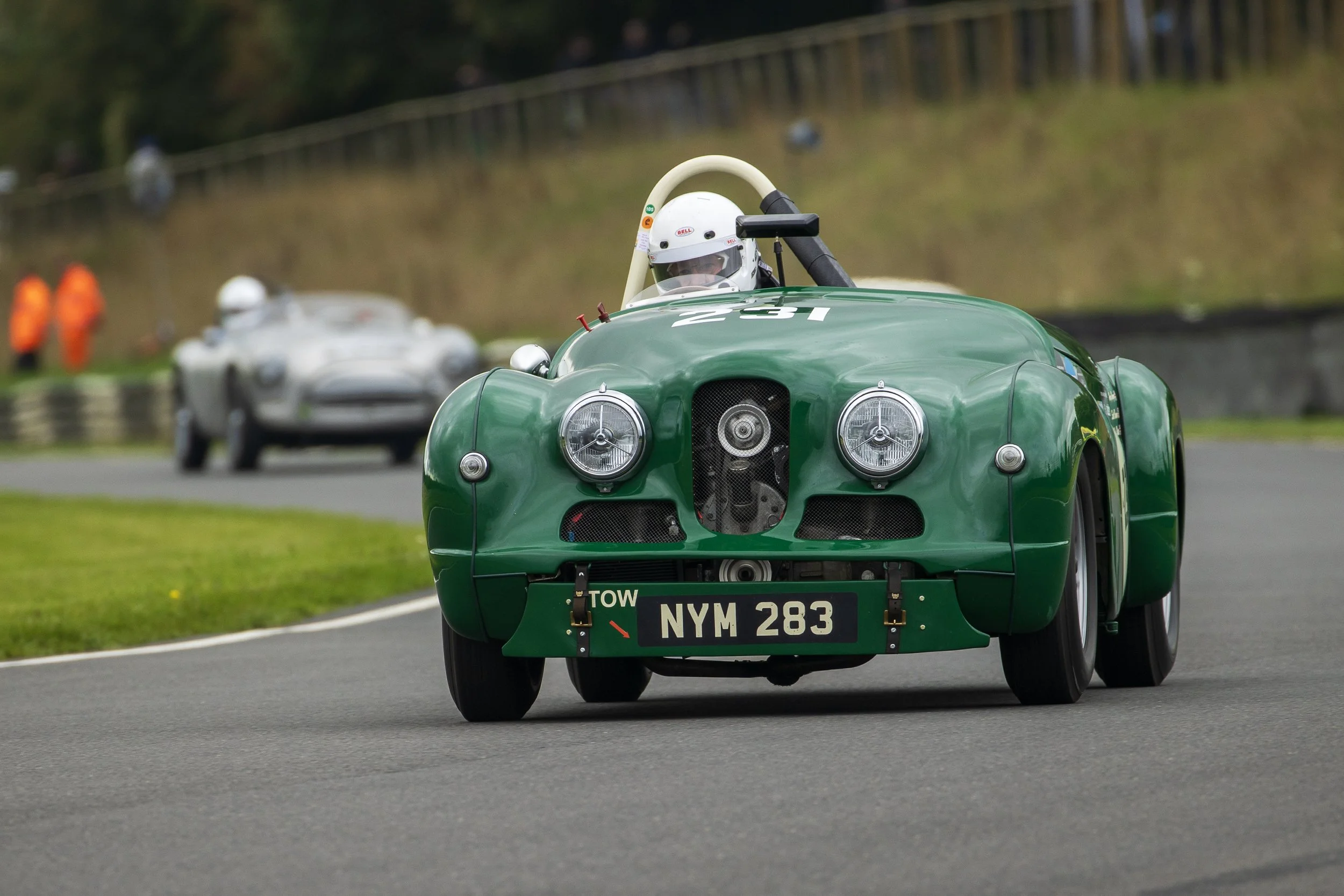 Mark Daniell was next up in his MGA Twin Cam, on 1.28.361, sharing row 6 with Mike Henney in the Turner Climax in a very close time of 1.28.448 and this had all the makings of a close encounter. Mark Hoble was 13th on the grid, in a time just half a second off Mike’s time on 1.28.984, in his Morgan +4 whilst alongside was Chris Mann, even closer on 1.29.053, in the Alfa Romeo Disco Volante, a car that is now so familiar to us, we sometimes overlook how incredibly special it is. In 15th, Barry Dye had his Lotus Elite in 15th, with a time of 1.30.278 on what in effect is his local track, although I use the word ‘local’ advisedly since it’s still a bit of a trek from Cornwall! He shared row 8 with Peter Baker’s lovely Aston Martin DB2 and it was good to see him back with us, on 1.31.047. Tristan Bradfield had qualified his Sunbeam Alpine Le Mans in a time of 1.31.047, but had pulled in early with oil pressure concerns. Alongside Tristan, Chris Bates had put Harry Naergar’s Jowett Jupiter in 18th position with a 1.32.576. Ed Shah was 19th on a time of 1.33.254 and only a very little slower on 1.33.358 was Gareth Evans in his Sunbeam Alpine. Unfortunately, after two hard years of opposite lock cornering, the rear nearside hub on the Alpine cried enough and decided to part company with the rest of the car, bringing Gareth’s qualifying to an early close and preventing a race start. Were we to be short of Sunbeam Alpine representation in the race?
