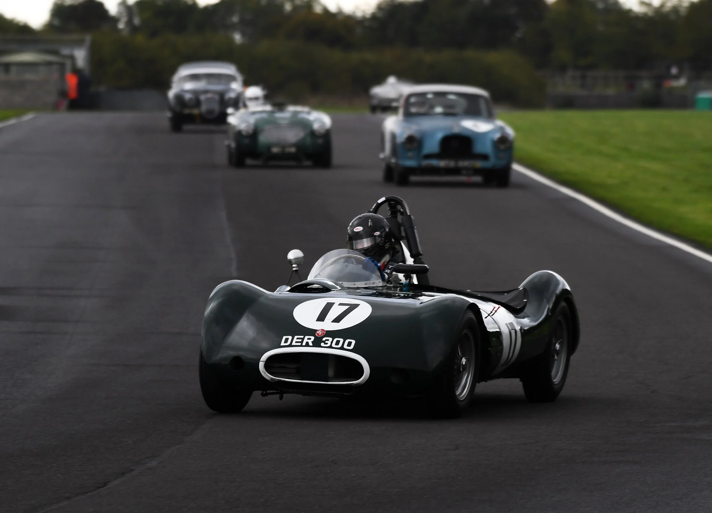 Mark Shears in the Flat Rad Morgan leads Andy Cox (TR3 Falcon) and Jeremy Woods Italia - an interesting and eclectic trio. Ed Shah trying to make ground on them in the Elva Courier, with Mark Campbell’s DB2, also in shot. Photo - Jeff Bloxham