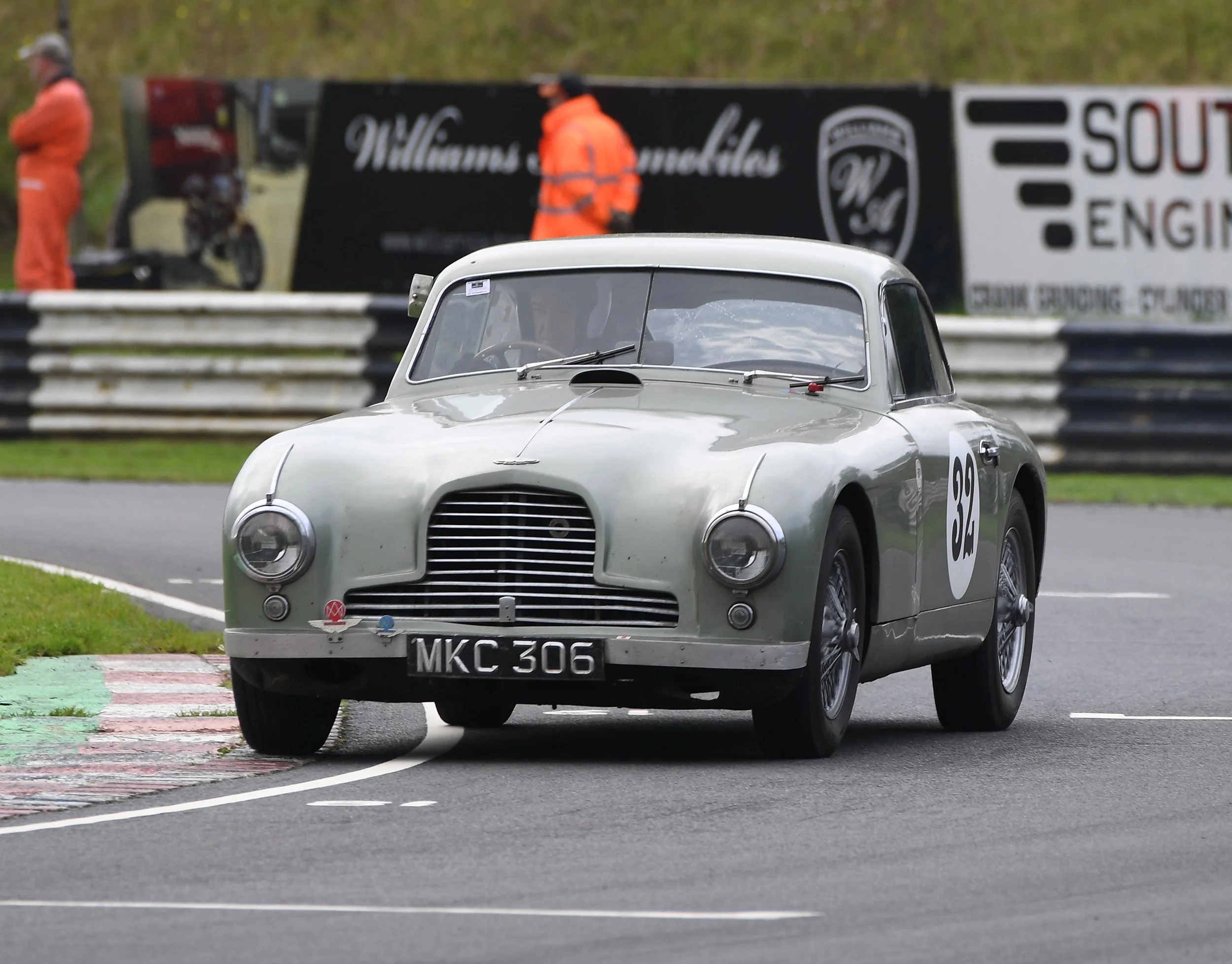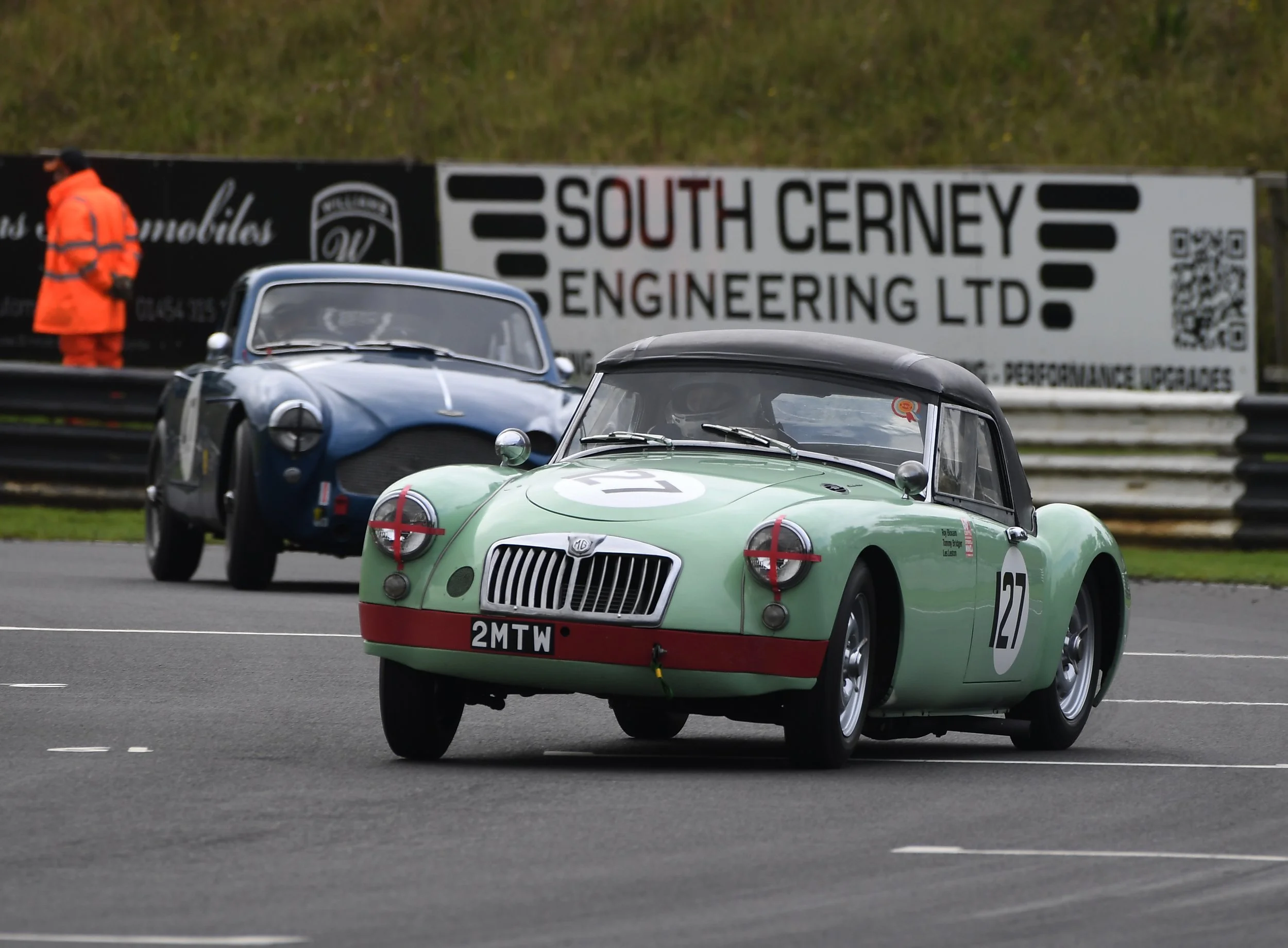 Mark Daniell, ‘giving it beans’ in the MGA Twin Cam whilst Simon Jefferies watches on in the Aston Martin DB MKIII, also showing a fair bit of roll.