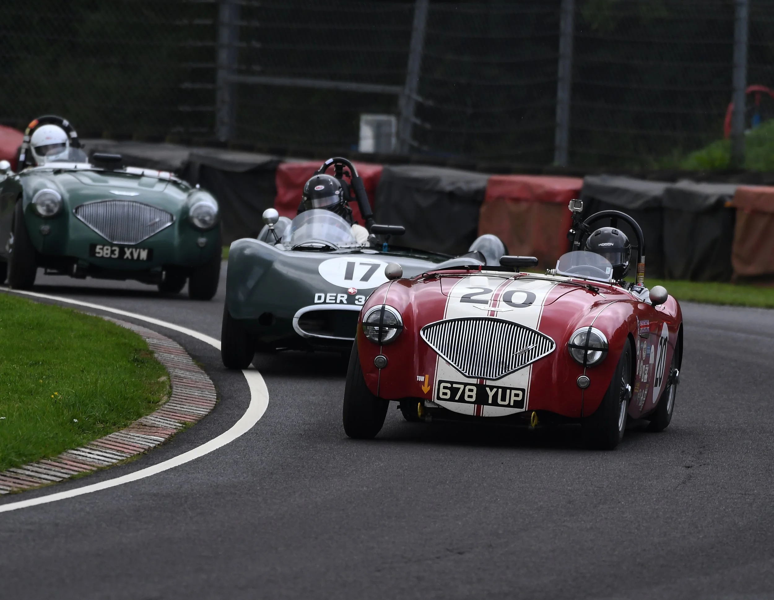 Marc Gordon eventually took his XK150 ahead of Tim Stamper’s Aston. Andy Shepherd’s AC Ace closing in behind. Photo - Peter Mallett@Tripos