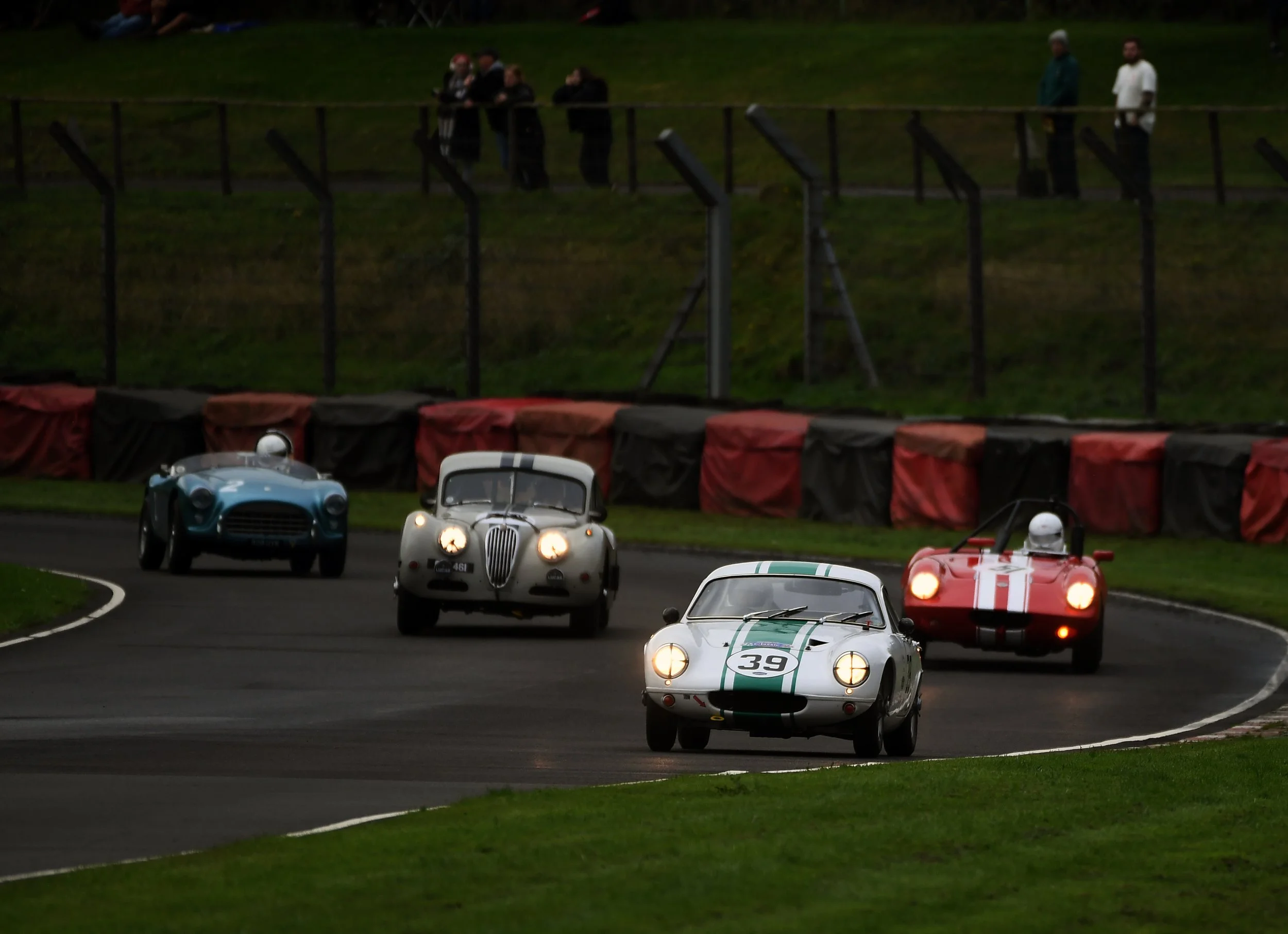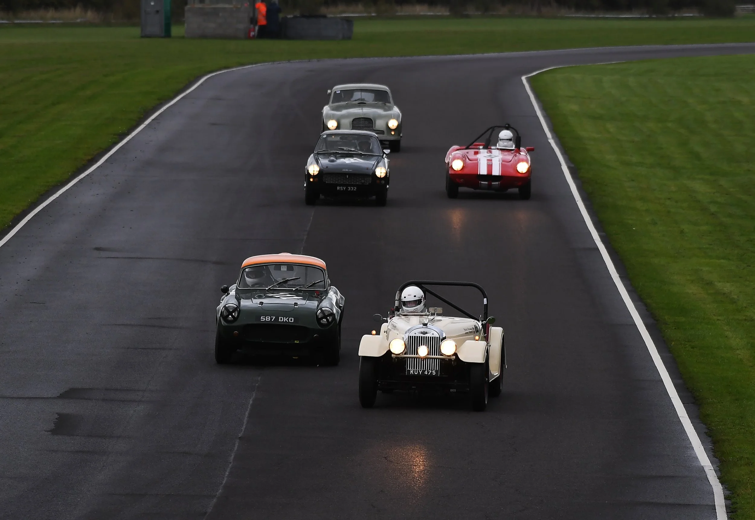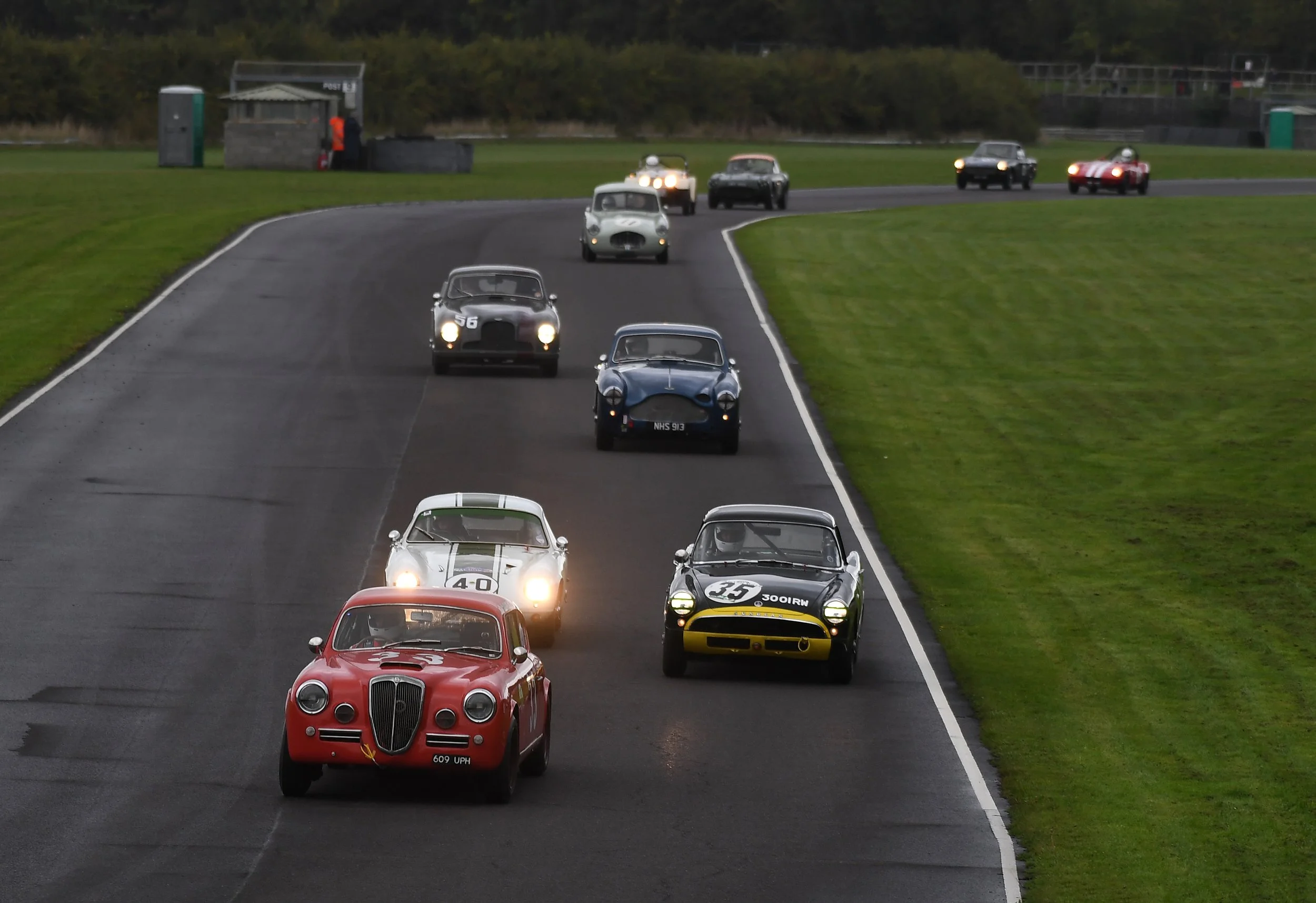 And still they keep coming. Jason Kennedy (Lancia Aurelia) leads Tristan Bradfield’s Sunbeam Alpine Le Mans who is attempting to go around the outside of Barry Dye’s Lotus Elite. Behind a brace of Aston Martins in the hands of Simon Jefferies and Peter Baker. Note that several cars have their headlamps on, emphasising the poor light caused by the heavy overcast cloud. Photo - Jeff Bloxham