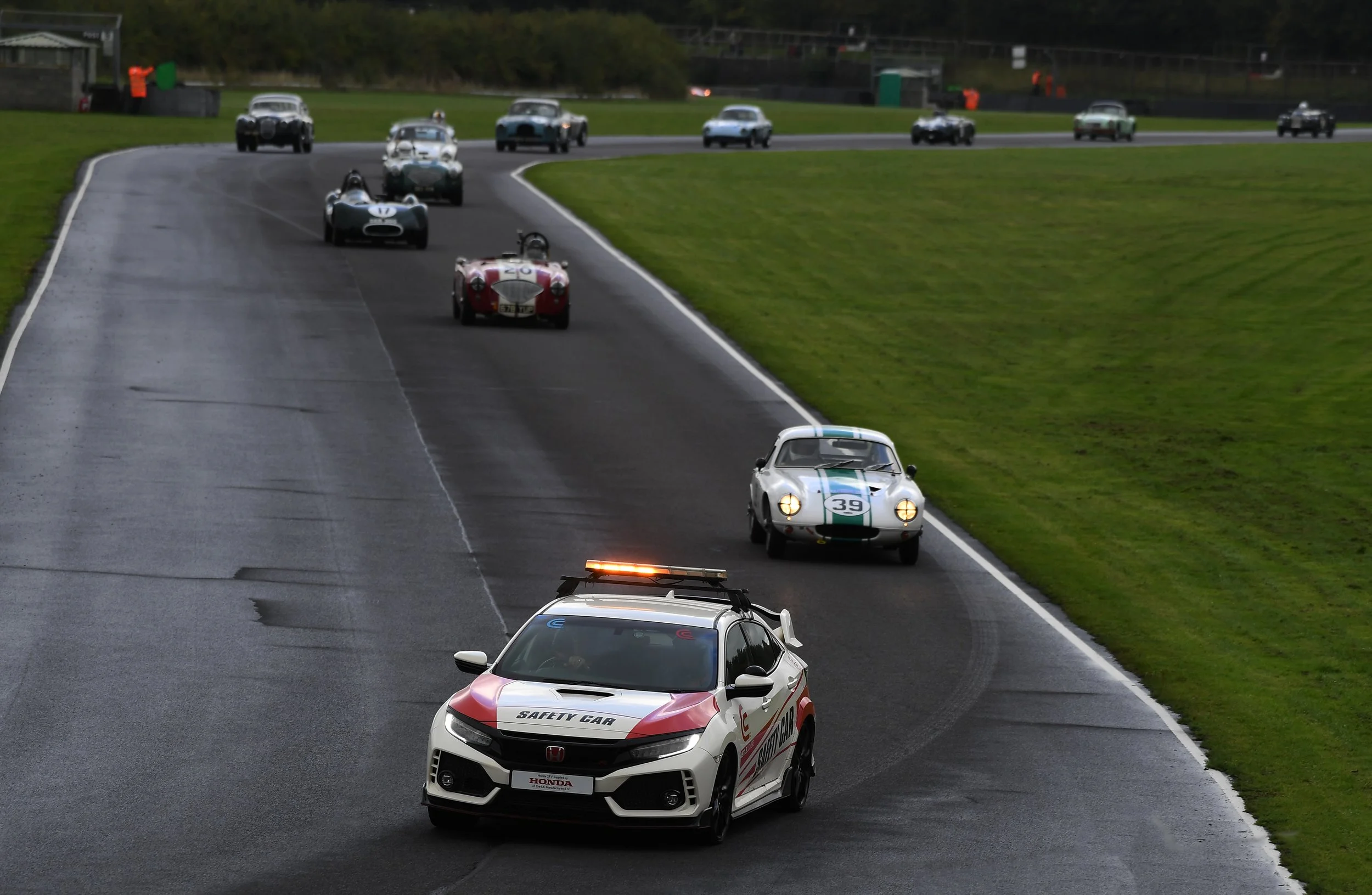 The Safety car took the field of cars around on two laps before they lined up on the grid. Note track conditions. Photo - Jeff Bloxham