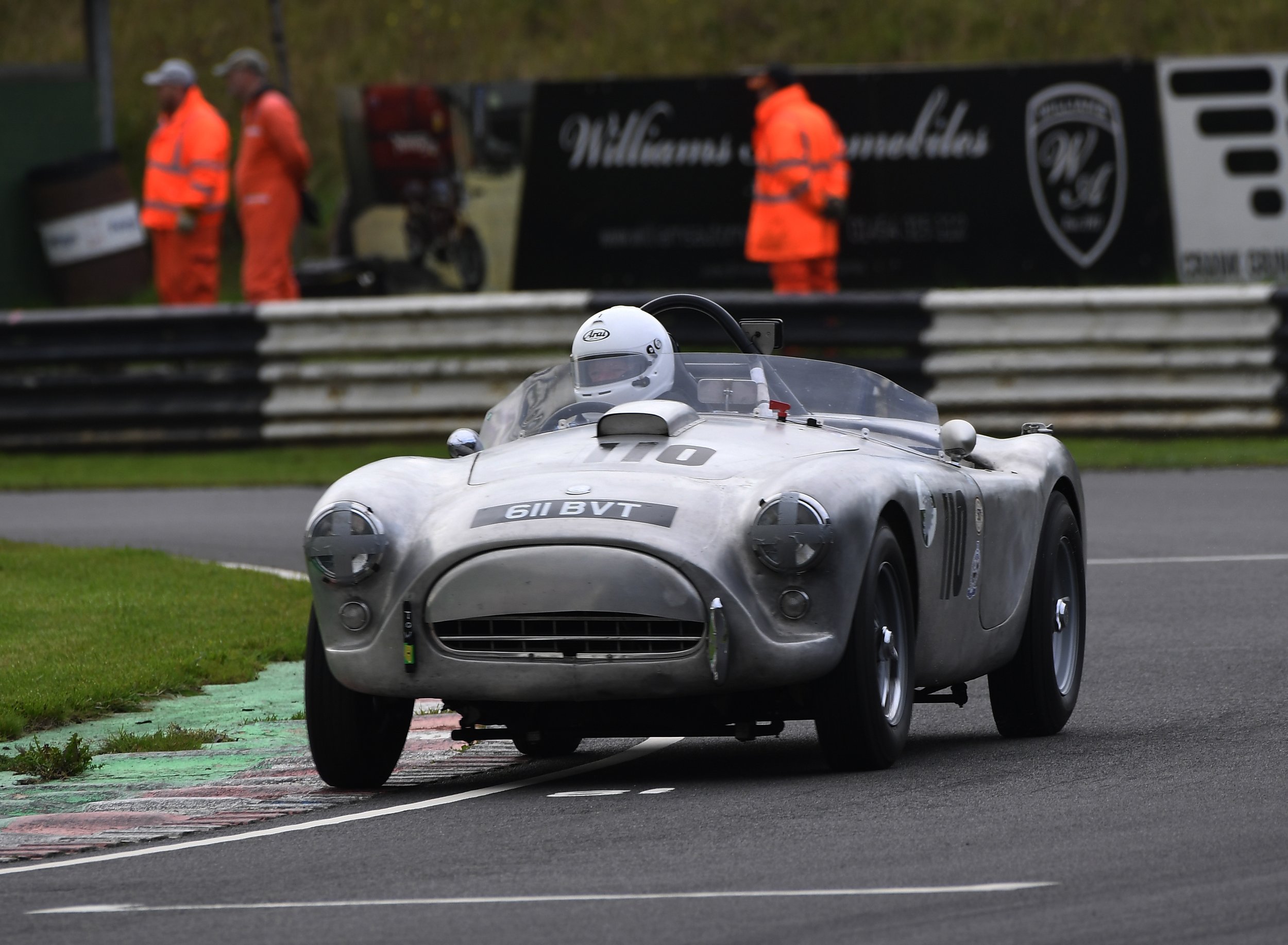 Heavy cloud hung over the circuit for qualifying but the track was dry. The anticipated battle for pole did not really materialise as David Alexander clocked a 1.23.461 to annex it in his Lotus Elite, over a second clear of Jonathan Abecassis in his Austin Healey 100/4. Jonathan’s time of 1.24.571 was itself over a second ahead of the LECo of Scott Quattlebaum who recorded a 1.25.887 although the gap to 4th placed Rory Tollett in the Austin Healey 100M was much smaller, less than a tenth behind on a 1.25.975. Half a second back in 5th with a time of 1.26.480 was Andrew Mitchell in his Lotus Elite which he was sharing with Mark Morgan, this pairing now performing consistently well. Another driver pairing was in 6th, the AC Ace entered by David Cottingham and shared with Adrian King with a best time of 1.26.668. Marc Gordon (Jaguar XK150) and Tim Stamper (Aston Martin DB2/4) shared the 4th row with times of 1.26.799 and 1.27.704. In view of past performances, I would have expected Marc to be a little higher up the grid but Tim’s time was pretty good considering that, historically, he has tended not to worry too much about his qualifying position. Andy Shepherd’s time of 1.27.781 kept him ahead of what appeared to be a slightly subdued Brian Arculus in his Lotus Elite, another who I would have expected to be a little higher up the grid. Brian’s time was 1.28.122 and I do wonder whether, despite a dry track, there was a certain degree of wariness on the part of the drivers to push too hard on this challenging track. Save it for the race!