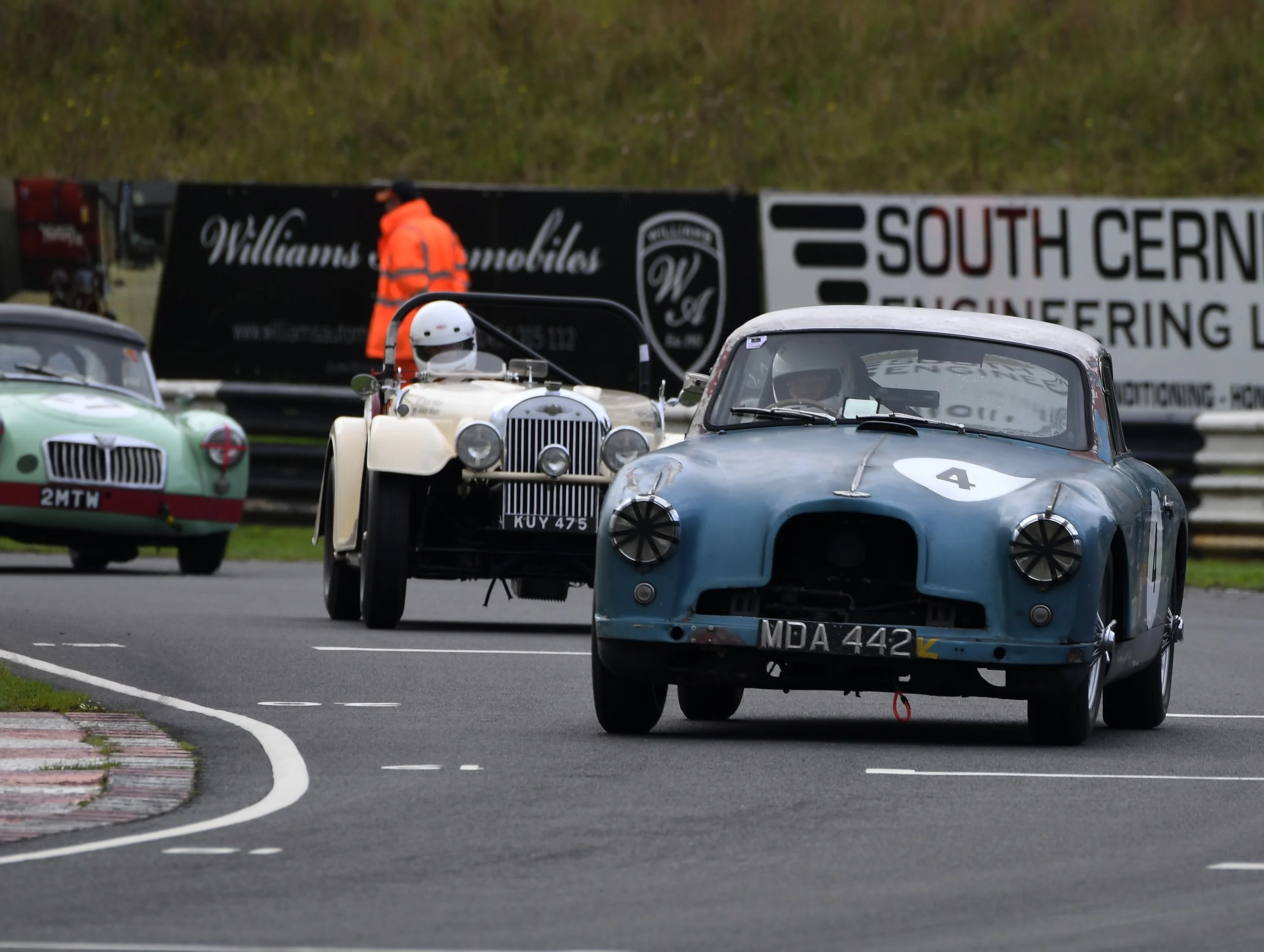 Rory Tollett about to pass Tim Stamper’s Aston. At this point Rory was the quickest on te track in the Austin Healey 100M. Photo - Jeff Bloxham